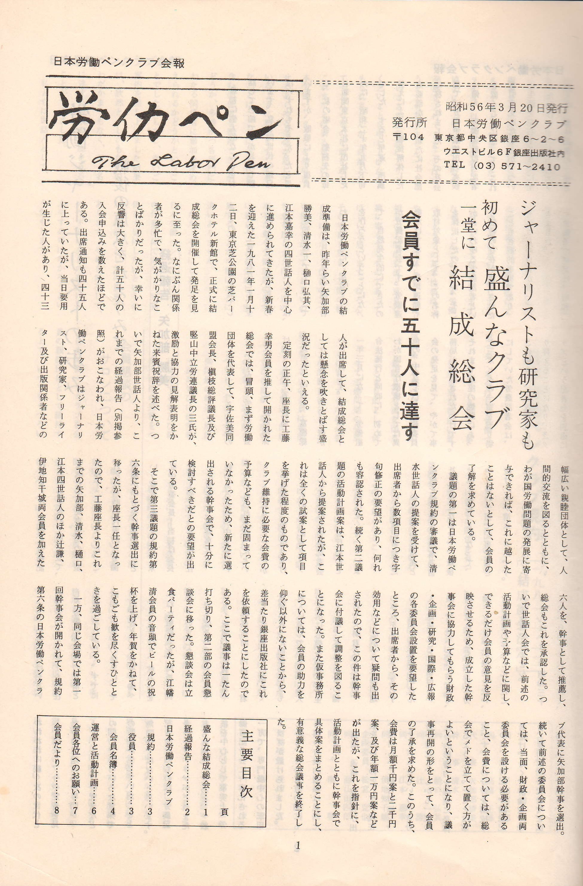 日本労働ペンクラブは、1981年1月結成された。矢加部勝美、清水一、樋口弘其、江本嘉幸、芦村庸介、内海一栄などの各氏が準備を重ね、結成にこぎつけた。ジャーナリストだけでなく、研究者、労組幹部などで構成、研究、意見交換など切磋琢磨することを目的とした。代表には矢加部勝美が就任。発足時の会員は50人であった。9月には「大河内一男先生を囲んで」(顧問、東大名誉教授)パーティーを開催した。